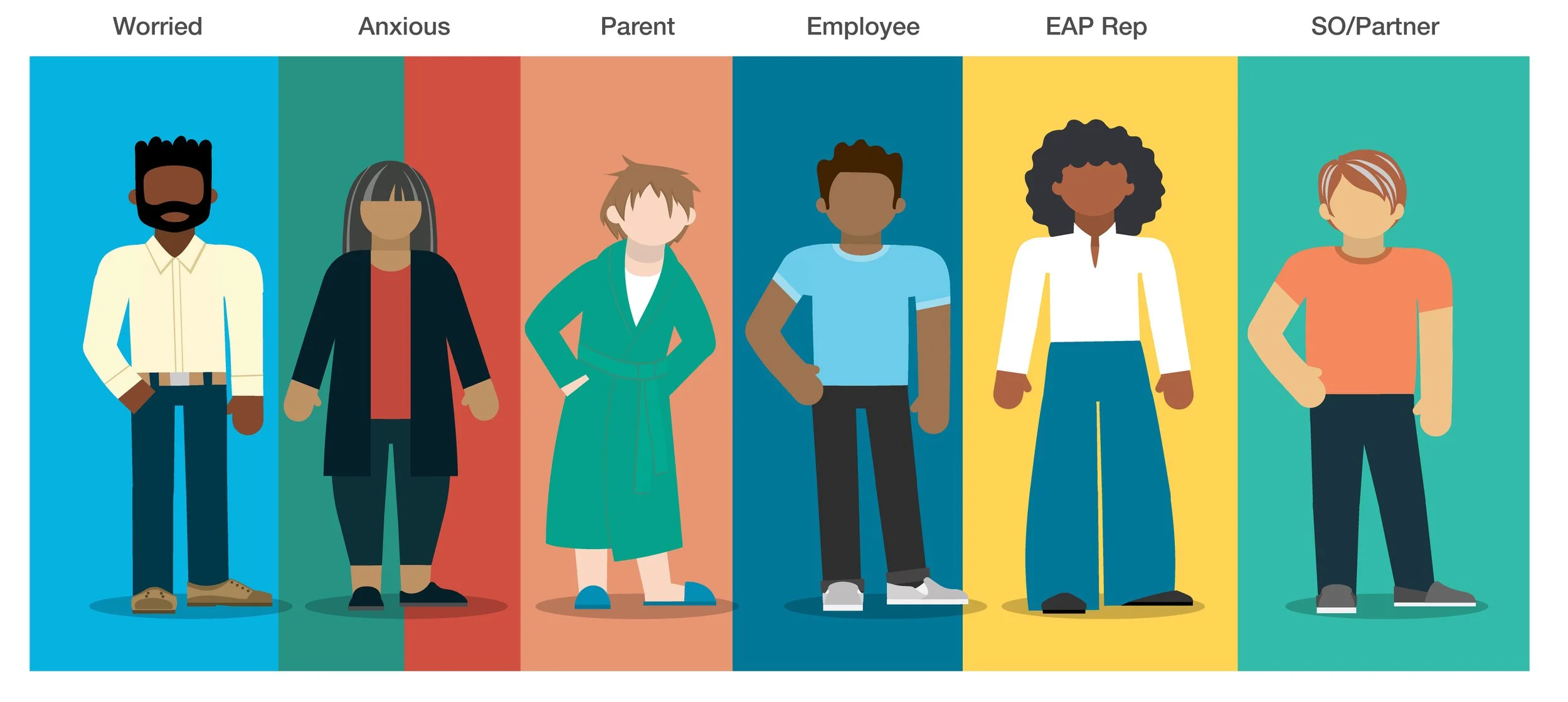 We developed characters for an EAP (Employee Assistance Program) video to be more inclusive. We used personas to make the characters more relatable. The characters represent a variety of race, body type and gender spectrums.